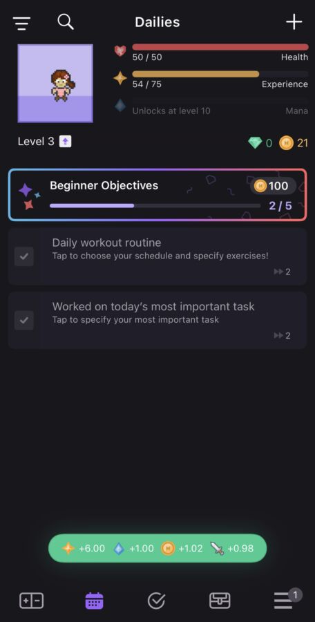 Habitica organises your tasks into three categories: Habits, Dailies, and To-Do’s. Habits are tasks you aim to do regularly, like drinking water or practicing mindfulness. Dailies are recurring tasks with deadlines, such as going to the gym or studying for an exam. To-Dos are one-time tasks, like booking a doctor’s appointment or finishing a project. Each time you check off a task, you gain experience and gold, strengthening your avatar and bringing you closer to your goals.