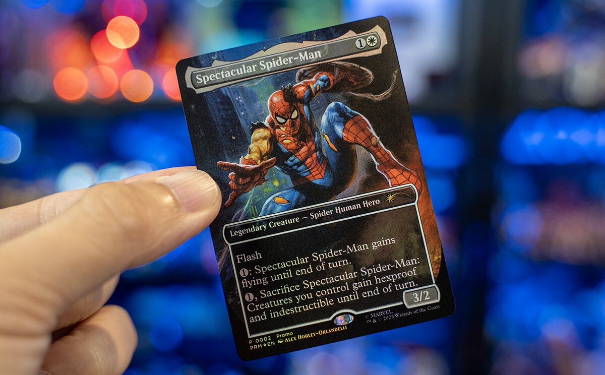 The exclusive foil Magic: The Gathering | Marvel’s Spider-Man card, “Spectacular Spider-Man”, can web-swing past your enemies or sacrifice himself for the greater good of the team.