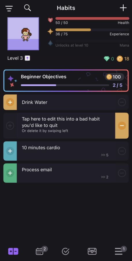 After downloading Habitica, you’re greeted with a charming pixelated world reminiscent of classic 90s video games. You’ll create your own unique avatar and select your habit goals, which can range from work and exercise to school, health, and chores. The app’s homepage features a dashboard displaying your avatar’s health and experience points, along with your initial objectives. Every time you complete a task, you earn coins – the in-game currency that fuels Habitica’s reward system. These coins can be used to purchase virtual tools and upgrades for your avatar, adding a tangible sense of progress to your accomplishments.
