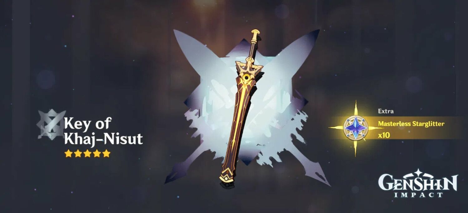 The Key of Khaj-Nisut carries the “Sunken Song of the Sands” capability, which bolsters the wielder’s health points by 20 percent and features health points as its upgradeable statistic. Upon successful impact of an elemental skill on an opponent, the Grand Hymn effect comes into play for a duration of 20 seconds.