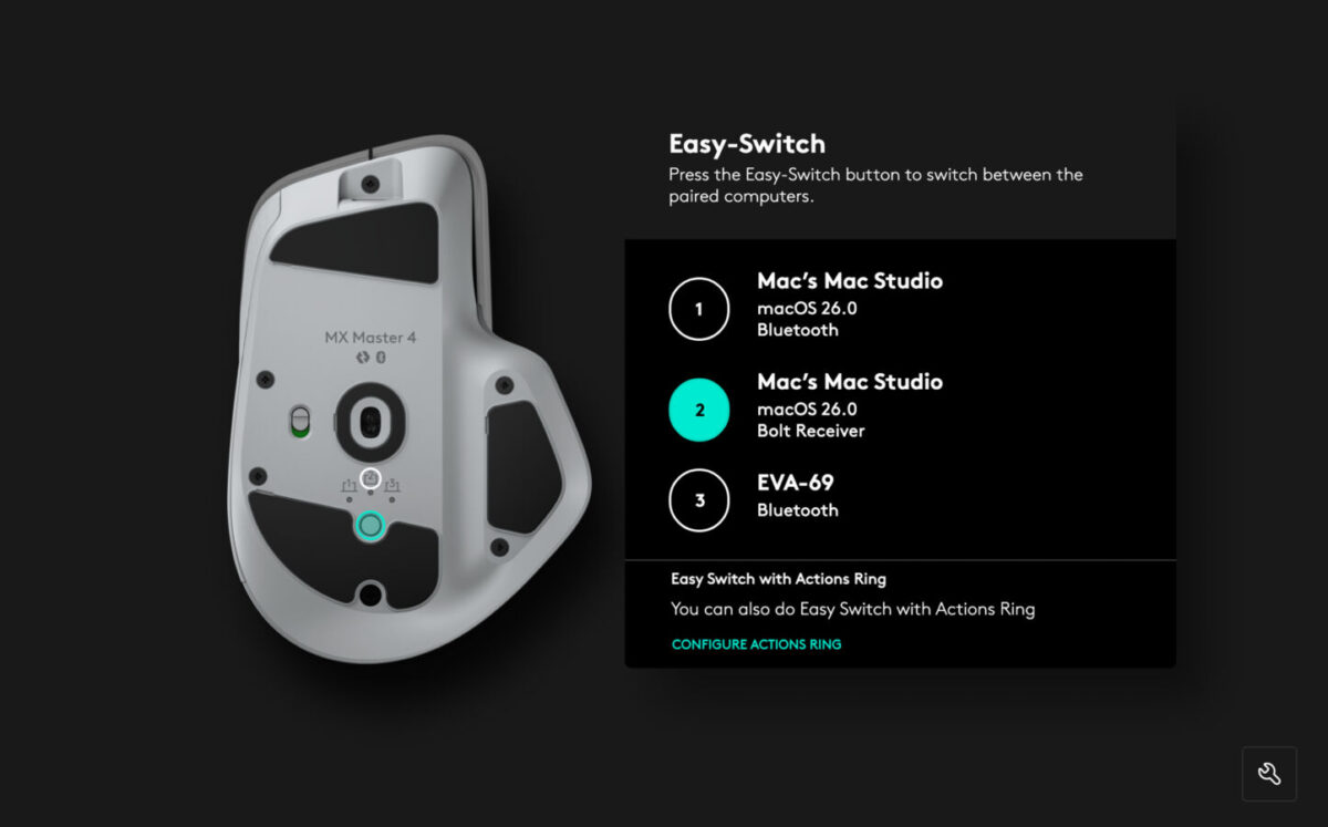 The base is identical to its predecessor, with a USB-C port that doubles as a receiver for a bolt receiver, an Easy Switch button that, well, switches between three paired devices and a power button that locks the haptic thumb rest in place when turned off. The starting DPI is set to 1,000 and can be adjusted in the Logi Options+ application in increments of 50. Besides the mouse sensitivity, you can also change the speed of its Magspeed wheel and the required force to activate the Actions Ring button, which is useful for preventing users with stronger grips from accidentally pressing against it.