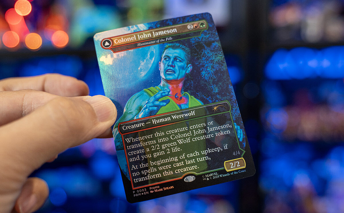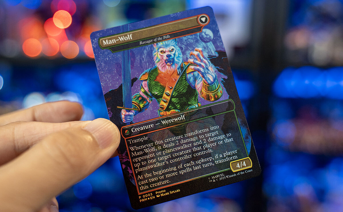 The exclusive foil Magic: The Gathering | Marvel’s Spider-Man double-sided card, “Colonel John Jameson (Hunter of the Fells)“ and “Man-Wolf (Ravager of the Fells)”, lets you enter the battlefield bringing a 2/2 wolf friend with you. Complete the transformation to Man-Wolf, grow stronger, and deal damage.