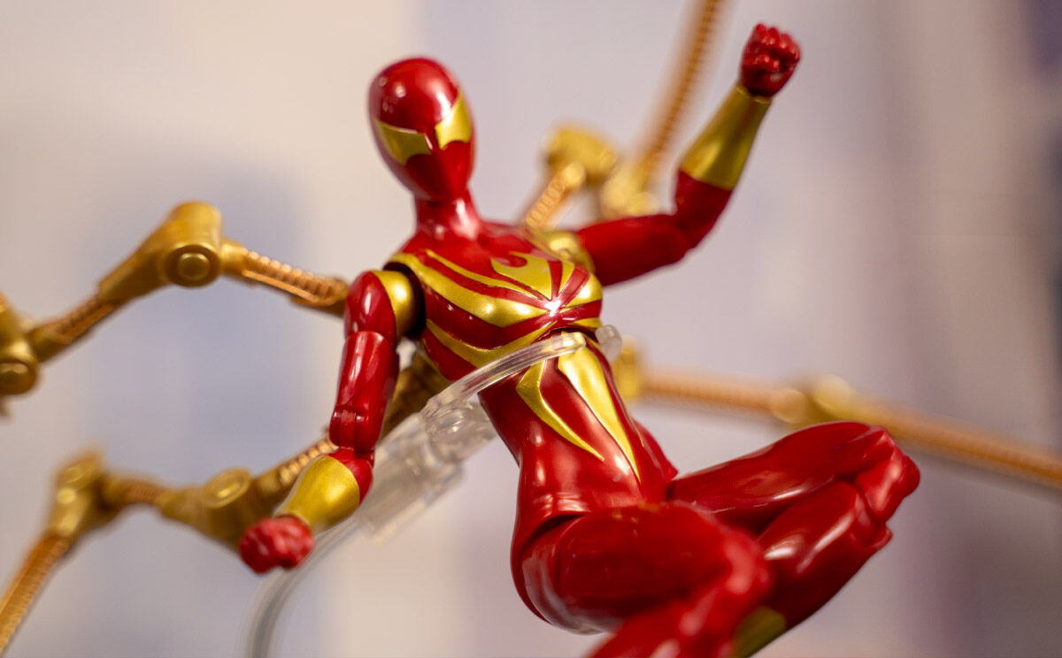 The figure comes with over 20 points of articulation and seven accessories – an alternate masked head sculpt, two ‘thwip’ web-shooting hands, and four articulated Iron Spider legs.