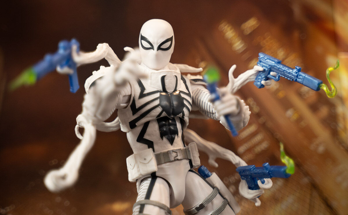 A one-time bully turned ally, Peter Parker’s friend, Flash Thompson, continues his war against the alien symbiote with this Agent Anti-Venom figure inspired by the character’s appearance in Marvel’s Spider-Man comics. After losing his legs in a car accident, he bonded with the black Venom symbiote to become Agent Venom, before losing it and then bonding with a new symbiote to become a color-inverted version of his Agent Venom form, now as white Agent Anti-Venom.