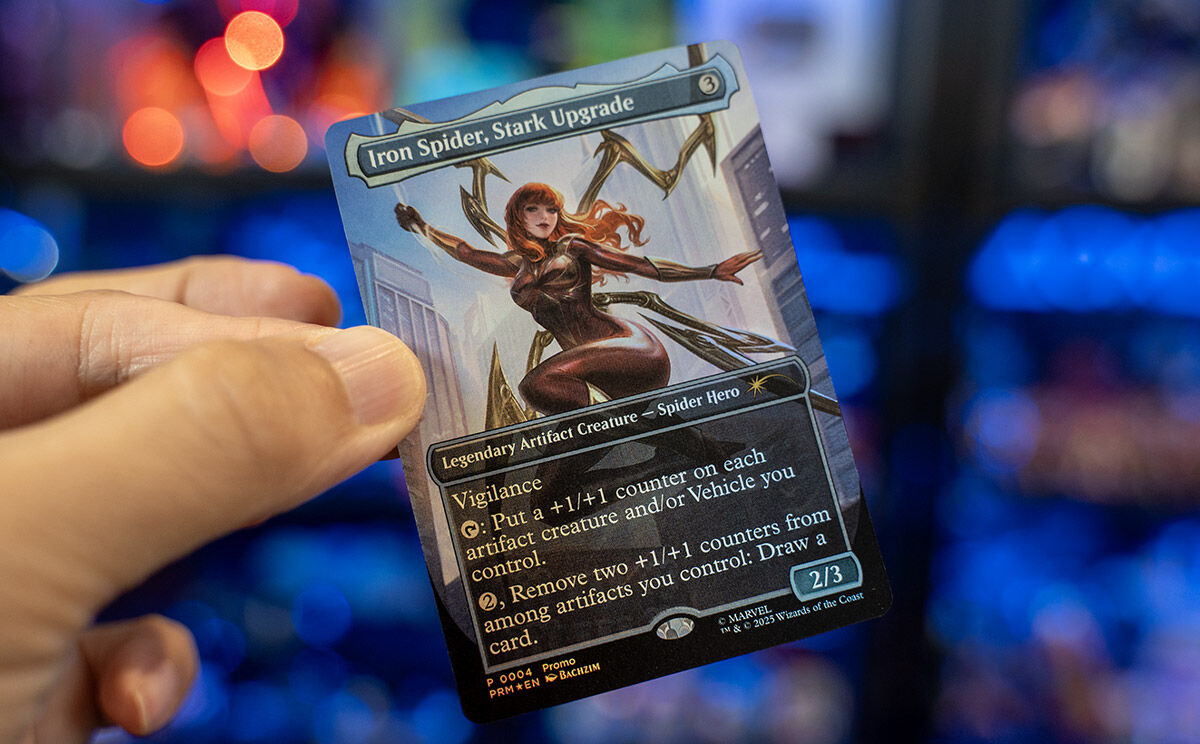 The exclusive foil Magic: The Gathering | Marvel’s Spider-Man card, “Iron Spider, Stark Upgrade”, improves your artifact army with +1/+1 counters and then converts those counters into resources to draw a card.