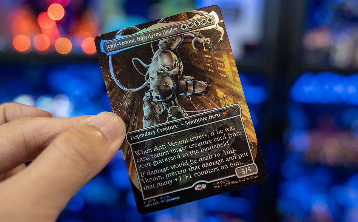The exclusive foil Magic: The Gathering | Marvel’s Spider-Man card “Anti-Venom, Horrifying Healer” can bring one of your creatures back to the battlefield. Anti-Venom gets stronger the more you damage him.