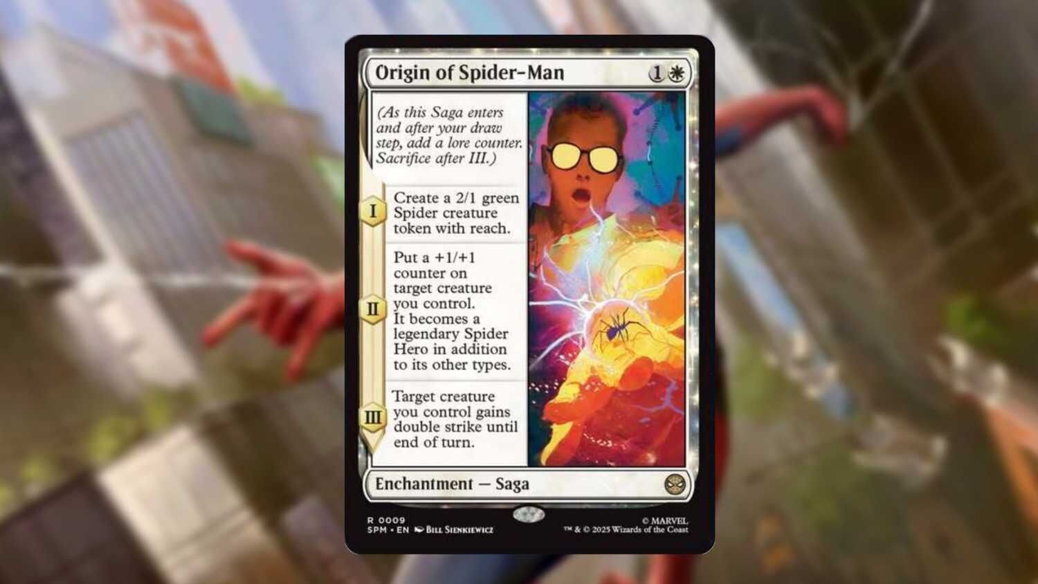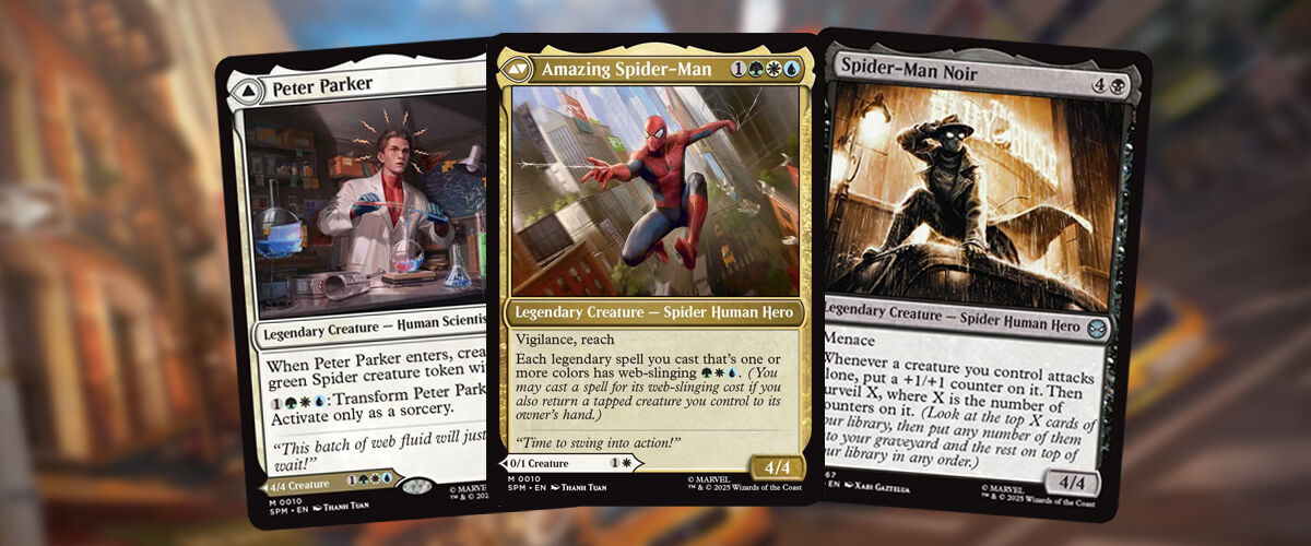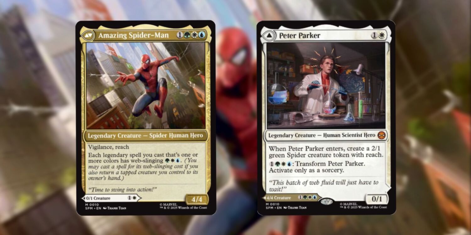 An exclusive first-look by IGN features a double-sided Peter Parker, which flips over into Amazing Spider-Man, Spider-Man 2099, SP//dr, Spider-Noir, and Spider-Ham, promising a fair amount of Into the Spider-Verse representation. There’s also an alternate art version of the Mythic Rare Peter Parker card that will bring the pages of Spider-Man’s adventures to life, though the design remains under wraps for now. The last on the list is Origin of Spider-Man, and all of them can be viewed below: