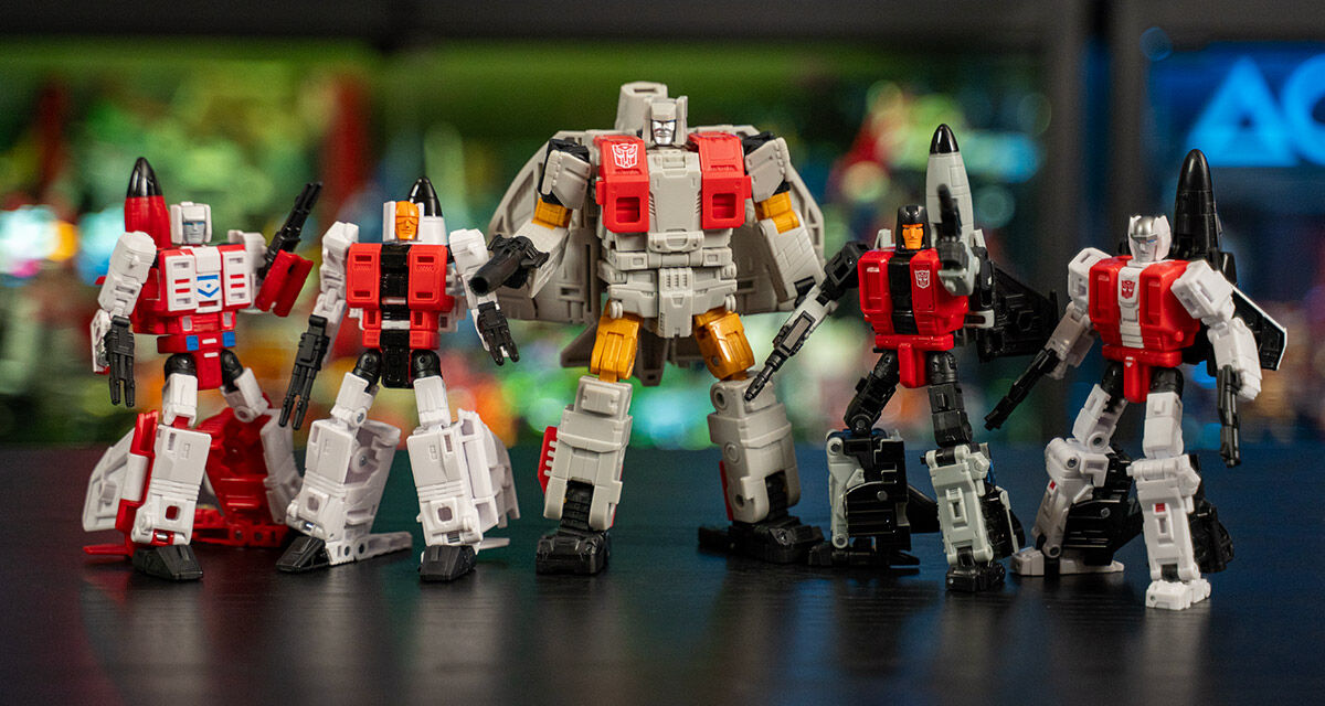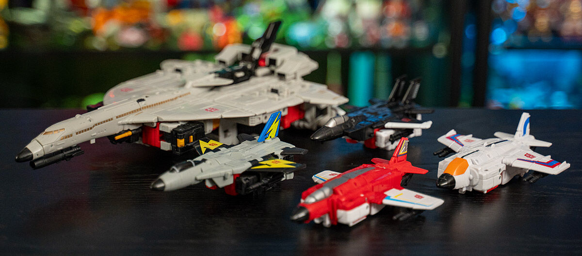 For the heroic Superion, Commander Class Silverbolt (released in May 2025) is surrounded by Deluxe Class Air Raid and Slingshot, which were released in April 2025, and by the upcoming Deluxe Class Firefight and Skydive, releasing in October 2025.