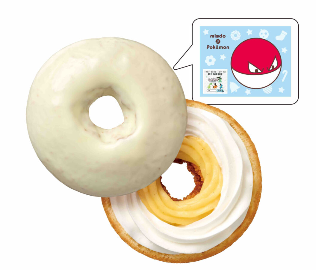 - Voltorb Donut White (¥226 / S$1.92): cake doughnut sandwiched with custard and whipped cream and covered in white chocolate.