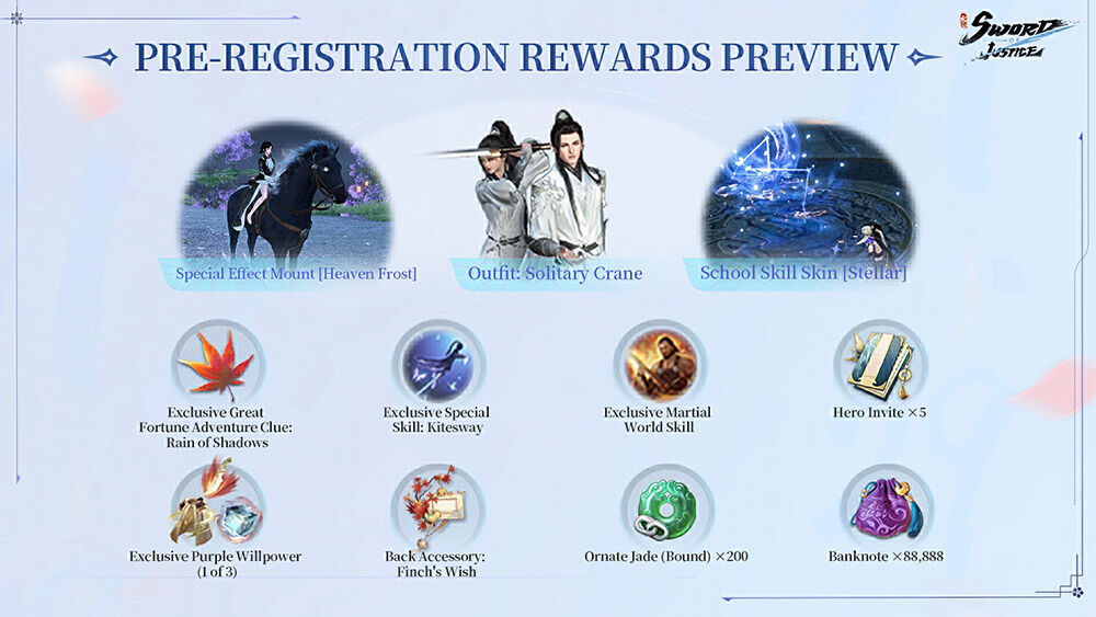 In addition, to mark the arrival of the game on a global stage, players who log into Sword of Justice will be able to claim the rewards unlocked by the 5 million players who pre-registered their interest in the game, including the Solitary Crane outfit, Heaven Frost Special Effect Mount, 200 Ornate Jade (Soulbound), and 88,888 Banknotes currency.