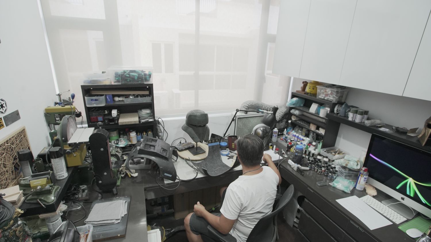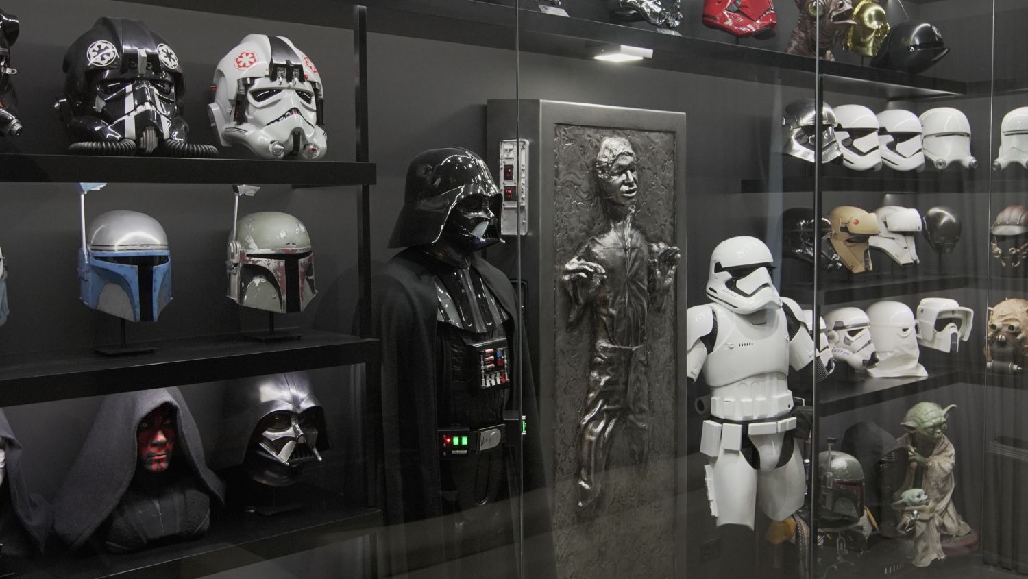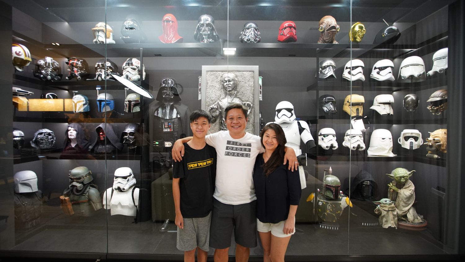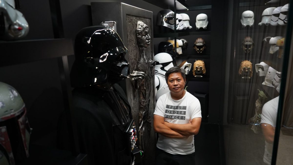 A helmet from a pilot? He has dozens. The weapons of a Stormtroopers or bounty hunter? They are hanging from a weapons display in his three-storey home. A life-size Darth Vader costume? It’s standing tall among his other Star Wars collection in his living room. Oh, that R2-D2 replica? It was hand-made, not store-bought.